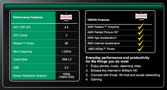 Sul fronte consumi grazie al processo produttivo a 40nm, si registra un TDP di 0.75W in idle, 1.12W durante la navigazione web ed 1.57W durante la riproduzione di filmati in Full HD (con risoluzione quindi di 1920 x 1080 pixel). Z-60 permetterà di giocare, secondo quanto rilasciato da AMD, a Call of Duty: Modern Warfare 2 ad una risoluzione di 1280 x 720 con dettagli medi.