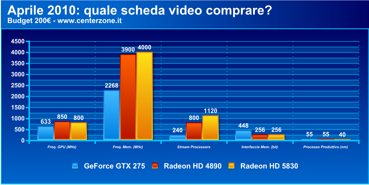 In questa fascia di prezzo si possono prendere in considerazione 3 schede video: per la precisione la ATI HD 4890, la NVIDIA GeForce GTX 275 e l’ultima di casa ATI, la HD 5830; tutte e 3 le schede hanno prestazioni molto simili, ma la HD5830, grazie al processo produttivo a 40nm è quella che consuma meno. Come per la HD 4850 si consiglia di prendere una versione della HD 4890 con dissipatore diverso da quello standard.