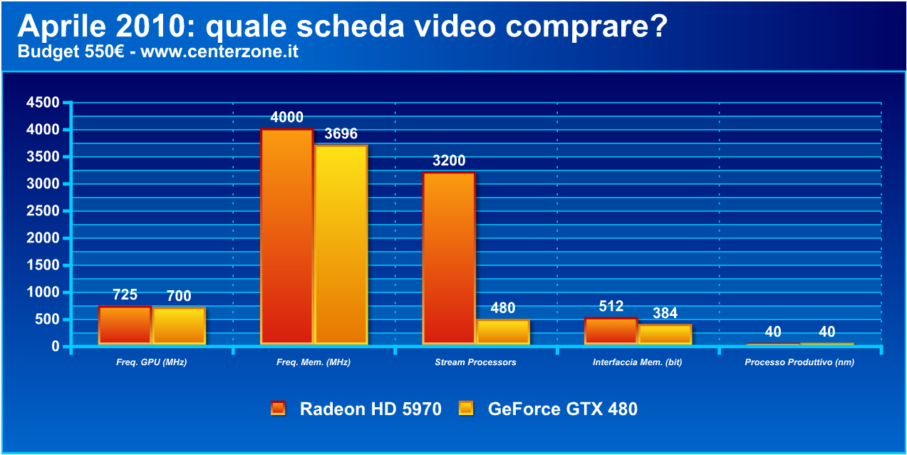 Su questa fascia NVIDIA non offre niente ma acirca 50€ in meno potete trovare il modello di punta dell’architettura Fermi, la GTX 480 che ha prestazioni inferiori alla HD 5970 ma superiori alla HD 5870.