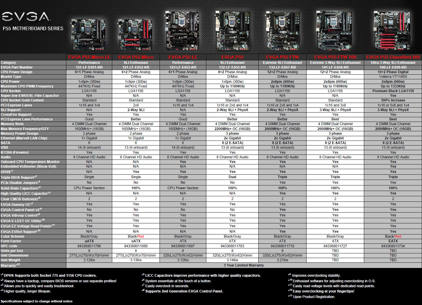 EVGA ha presentato nella giornata di oggi la line-up completa di motherboard equipaggiate con chipset Intel P55. Come è possibile vedere dall’immagine, la serie comprende le schede P55 Classified 200, P55 FTW 200, P55 FTW, P55, P55LE, P55 Micro e P55 Micro LE. Di seguito una piccola analisi di tutte le motherboard disponibili: