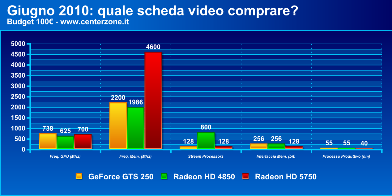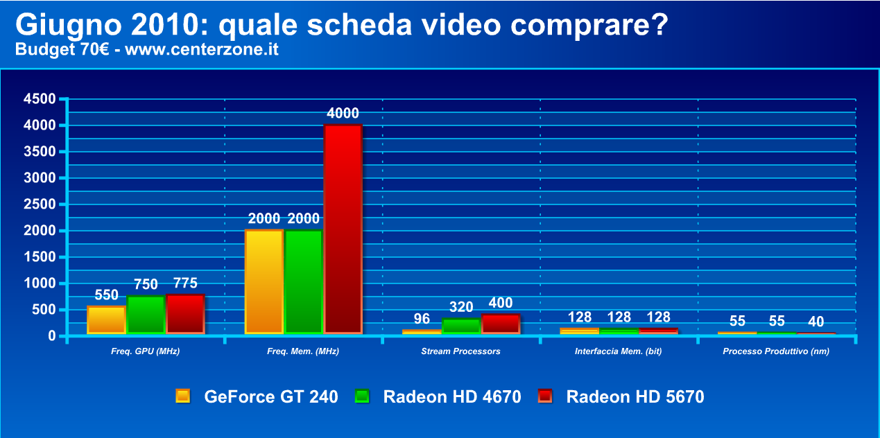 Per la fascia di prezzo più economica è consigliabile scegliere le proposte ATI Radeon HD 4670 e Radeon HD 5670 (a dire il vero quest’ultima costa qualcosa in più) che la NVIDIA GT240; queste schede video permettono di giocare a quasi tutti i giochi con impostazioni grafiche al massimo, filtri compresi, a risoluzioni fino a 1280×1024. Naturalmente con giochi particolarmente pesanti dal punto di vista grafico come ad esempio Crysis o GTA4 bisognerà scendere a qualche compromesso. Le versioni consigliate sono quelle con 512MB di ram video; ci sarebbero anche le versioni da 1GB ma le prestazioni sarebbero le medesime dato che queste schede non sono così veloci da sfruttare tale quantità di memoria.