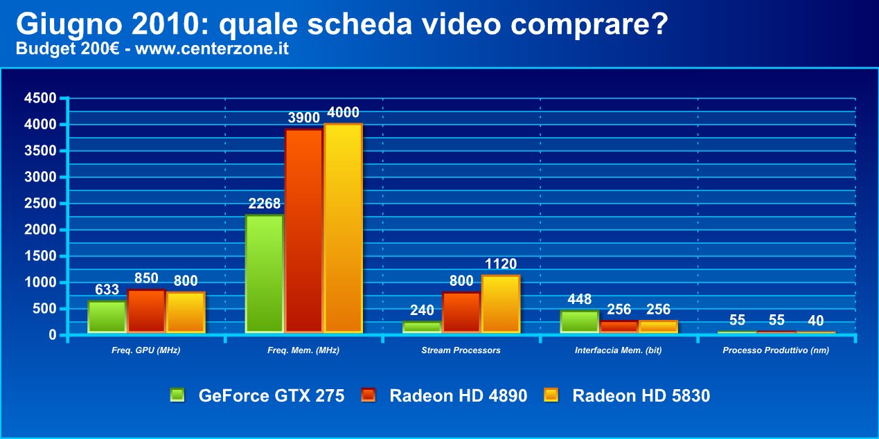 In questa fascia di prezzo si possono prendere in considerazione 3 schede video: per la precisione la Radeon HD 4890, la NVIDIA GTX 275 e l’ultima di casa ATI, la Radeon HD 5830; tutte e 3 le schede hanno prestazioni molto simili, ma la HD 5830, grazie al processo produttivo a 40nm è quella che consuma meno. Come per la HD 4850 si consiglia di prendere una versione della HD 4890 con dissipatore diverso da quello standard.