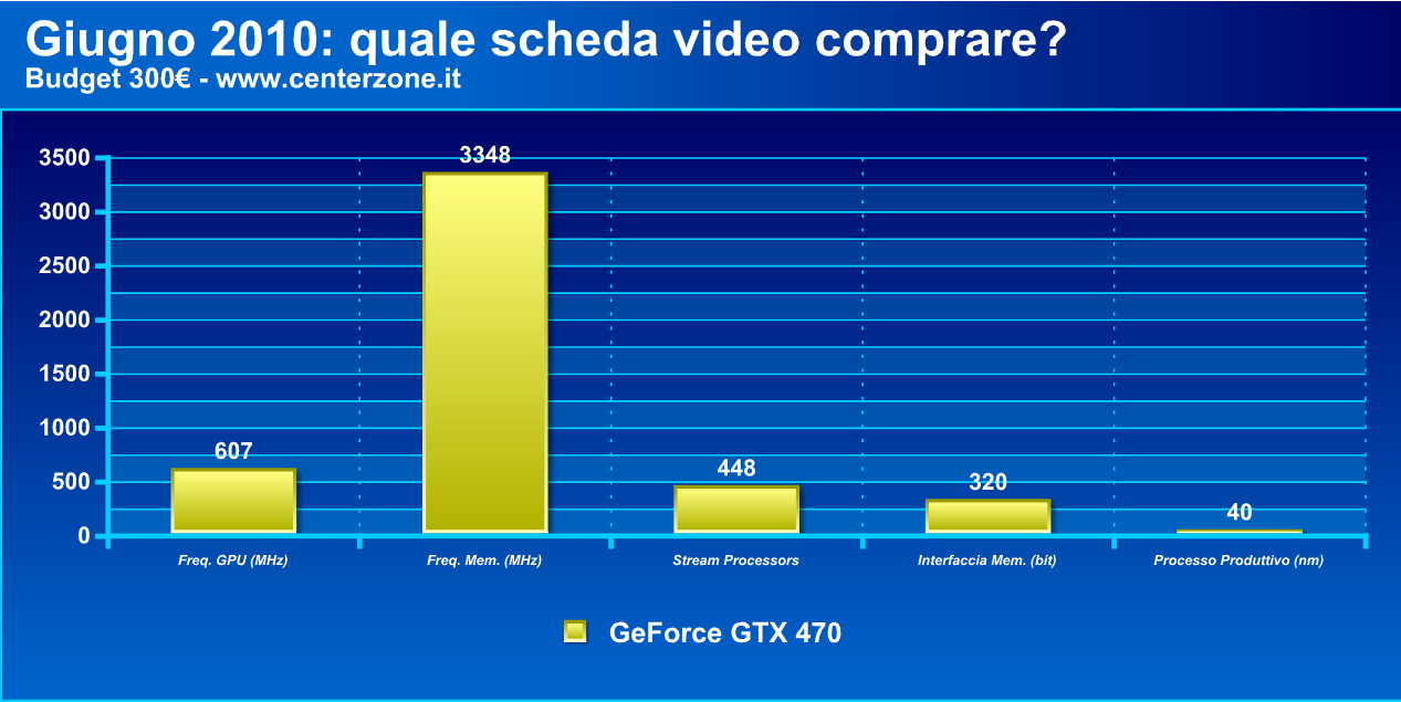 L’unica scheda appartenente alla fascia di prezzo dei 300€ è la GTX 470. Questa scheda, come prestazioni, si va a piazzare tra la HD 5850 e la HD 5870 in DX10 mentre in DX11 si avvicina molto alle performance di quest’ultima. Unico neo, consuma molto di più delle proposte ATI.
