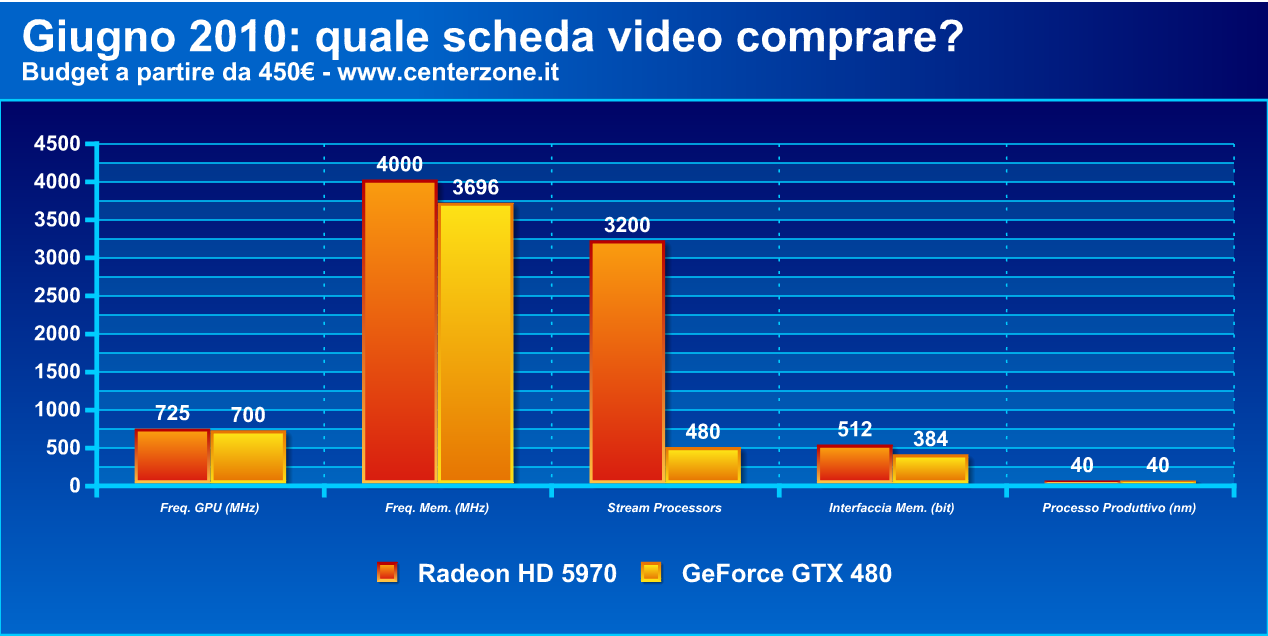 Su questa fascia NVIDIA non offre niente ma a circa 50€ in meno potete trovare il modello di punta dell’architettura Fermi, la GTX 480 che ha prestazioni inferiori alla HD 5970 ma superiori alla HD 5870.