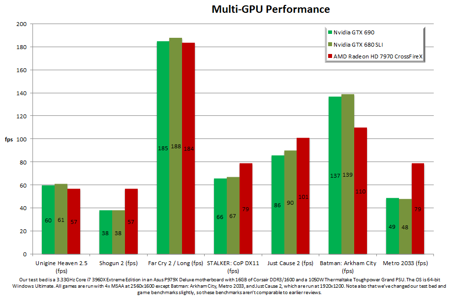 Nell’eterna sfida NVIDIA vs. AMD invece, la GTX 690 deve cedere il passo in quasi tutti i videogiochi ad una configurazione composta da due Radeon HD 7970 in CrossFire; gli FPS in meno fatti registrare dalla 690 (e dallo SLI di due 680) sono però più che giustificati (e ripagati) da consumi energetici ottimi, leggermente più alti in idle rispetto al CF di 7970 ma inferiori a quest’ultima configurazione di ben 200W quando il sitema è a pieno regime.