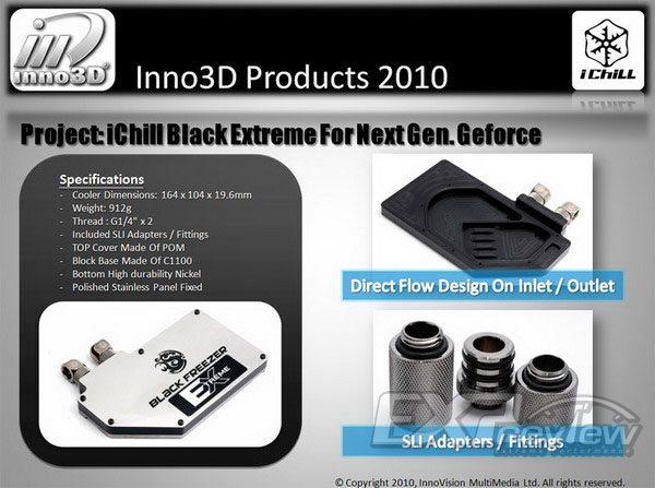 Inno 3D ha annunciato di essere a lavoro su un sistema di dissipazione a liquido per le nuove GPU NVIDIA Fermi. In particolare il waterblock, appartenente alla famiglia iChill, sarà caratterizzato da dimensioni di 164 x 104 x 19.6mm, peso di 912g e compatibilità con configurazione SLI. Per il momento non sono state rilasciate ulteriori informazioni; torneremo sull’argomento non appena saranno disponibili le nuove soluzioni Fermi (26 Marzo).