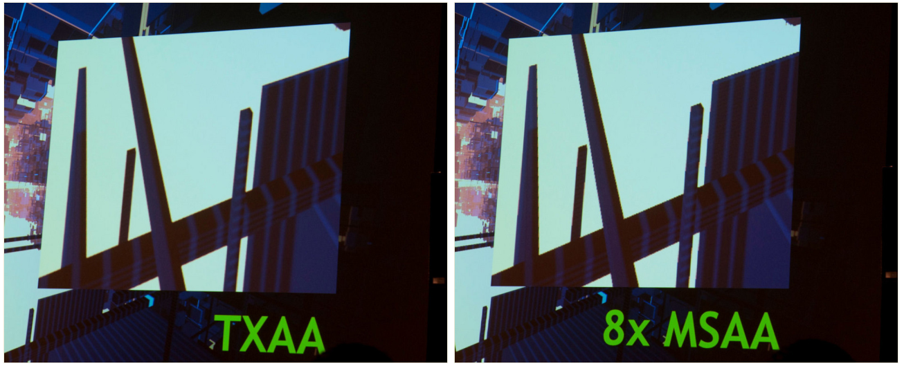 In particolare saranno ben due i livelli di antialiasing TXAA; il primo, denominato semplicemente TXAA1 qualitativamente sarà paragonabile alla versione 16x MSAA con degradamento delle prestazioni simile alla versione 2x MSAA mentre, il secondo, TXAA2 garantirà qualità superiore alla versione 16x MSAA con un impatto sulle prestazioni paragonabile alla versione 4x MSAA.