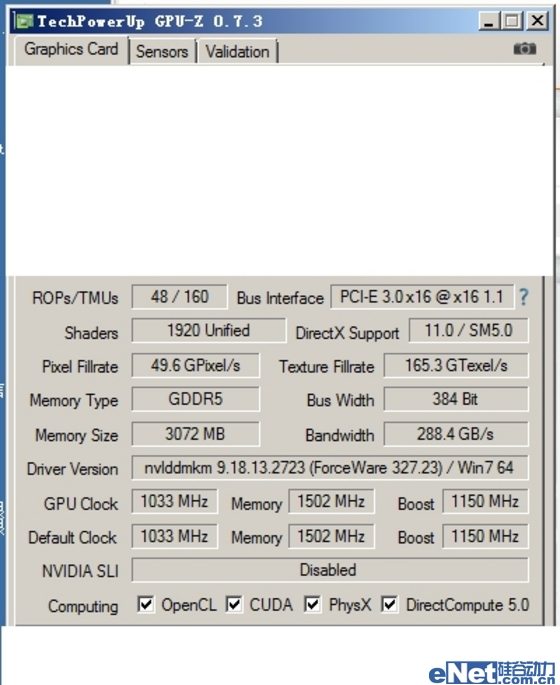 Giungono indiscrezioni anche su quelle che dovrebbero essere le frequenze di funzionamento; grazie ad uno screen di GPU-z, si apprende che la nuova scheda video NVIDIA sarà caratterizzata da frequenze per GPU/Memorie rispettivamente di 1033MHz e 1502MHz con interfaccia a 384 bit.