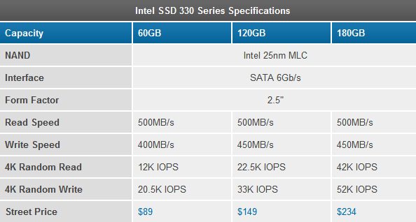 Giungono interessanti informazioni sui nuovi hard disk SSD Intel Serie 330. Grazie al sito Anandtech, veniamo a conoscenza di quelle che sono le caratteristiche tecniche e prezzi di lancio. Le unità Intel saranno equipaggiate con chip NAND Flash Intel da 25nm, interfaccia SATA 6GB/s e capacità da 60GB, 120GB e 180GB.