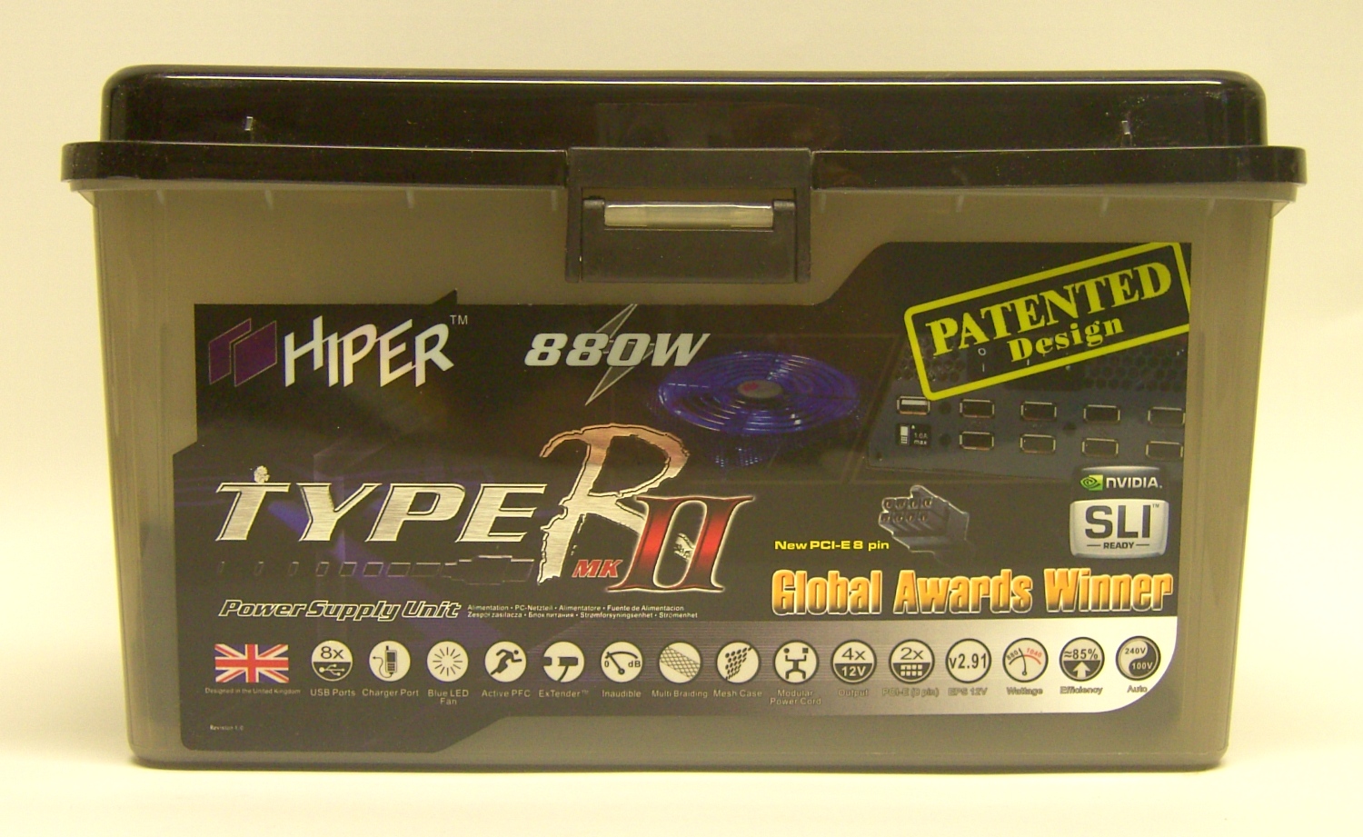 Clicca per ingrandire L’alimentatore Type R MK II HPU-5K 880W si presenta in una pratica valigetta in plastica di generose dimensioni. Nella parte frontale troviamo il logo dell’azienda, il wattaggio del PSU e altre utili informazioni riguardo le fondamentali caratteristiche tecniche dell’alimentatore. Nella parte posteriore sono raccolte invece informazioni riguardo i connettori/cavi, accessori e caratteristiche tecniche fondamentali.