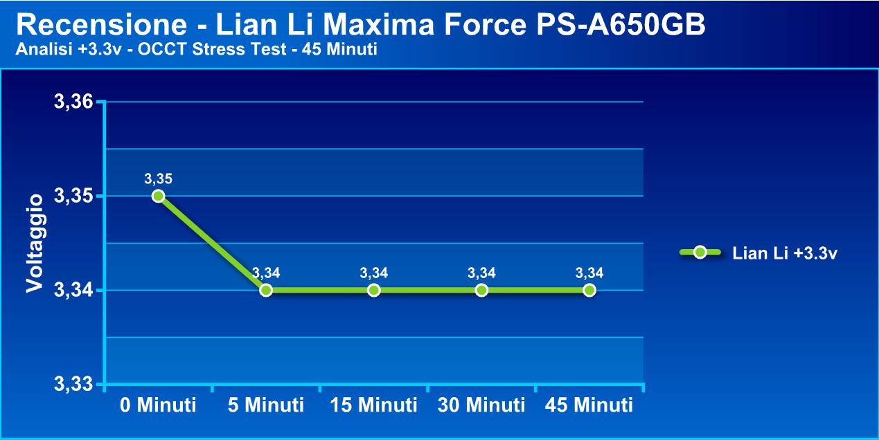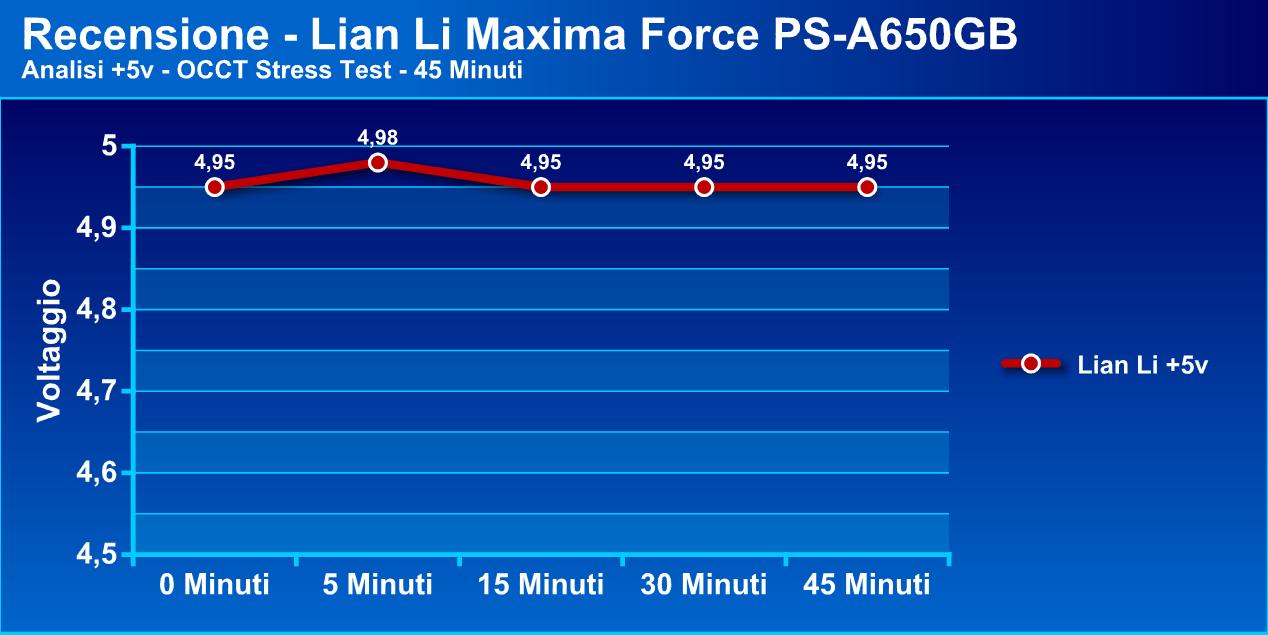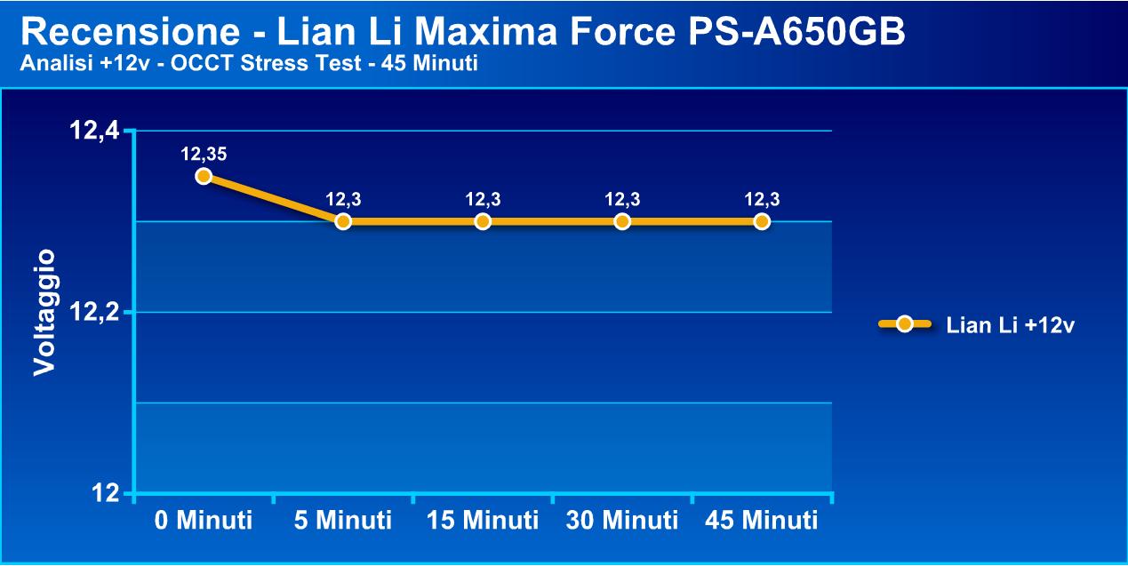Da segnalare inoltre l’ottima silenziosità di funzionamento dell’alimentatore. Nonostante i 45 minuti di stress test, il Maxima Force si è rivelato molto stabile nelle temperature e nei voltaggi.
