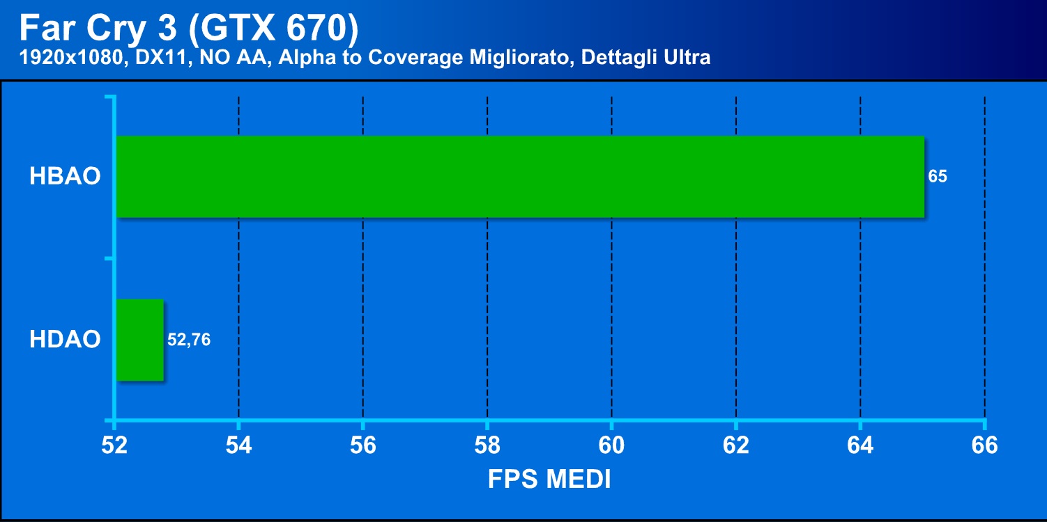 Dopo diversi test, abbiamo deciso di riassumere il tutto come nel grafico che vedete. Abbiamo cioè voluto sottolineare che, almeno con schede grafiche Nvidia, conviene decisamente abilitare l’HBAO piuttosto che l’HDAO, dato che con quest’ultimo il gioco fatica di più a girare fluido. Entrambi costituiscono due interpretazioni diverse dell’Occlusione Ambientale, un effetto grafico molto importante e presente in quasi tutti i giochi DirectX 11, che aumenta il realismo delle ombre in base all’Illuminazione Globale. Andando in ordine di “qualità”, abbiamo: