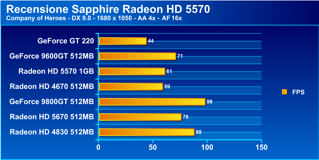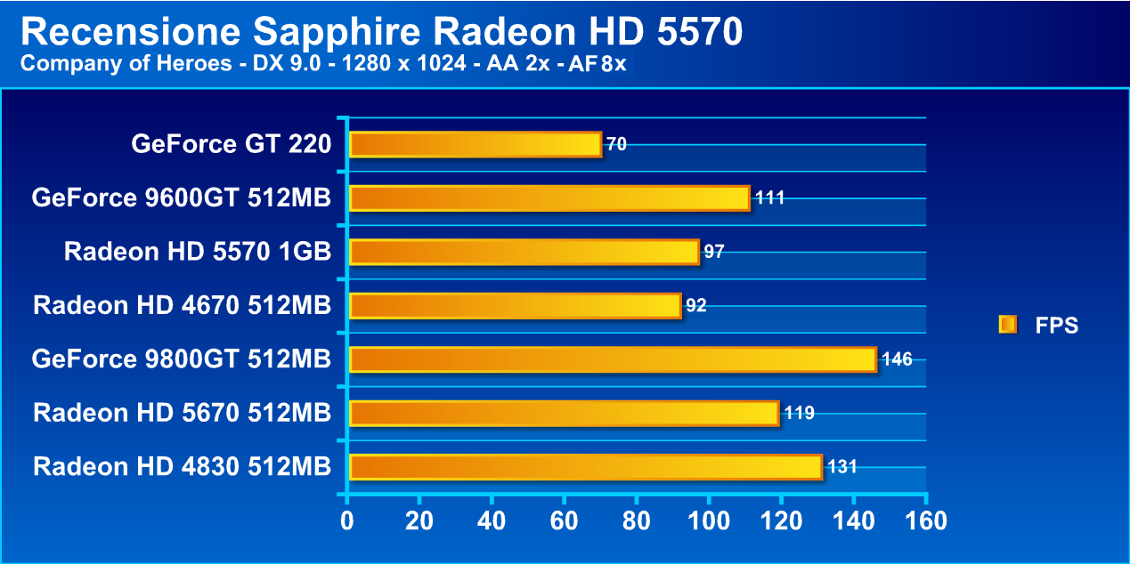 Con il videogioco Company of Heroes la soluzione NVIDIA riesce a staccare di diversi FPS le proposte targate ATI. Per quanto riguarda il modello Radeon HD 5570 fa registrare prestazioni superiori rispetto al modello HD 4670 e simili alla GeForce 9600GT.