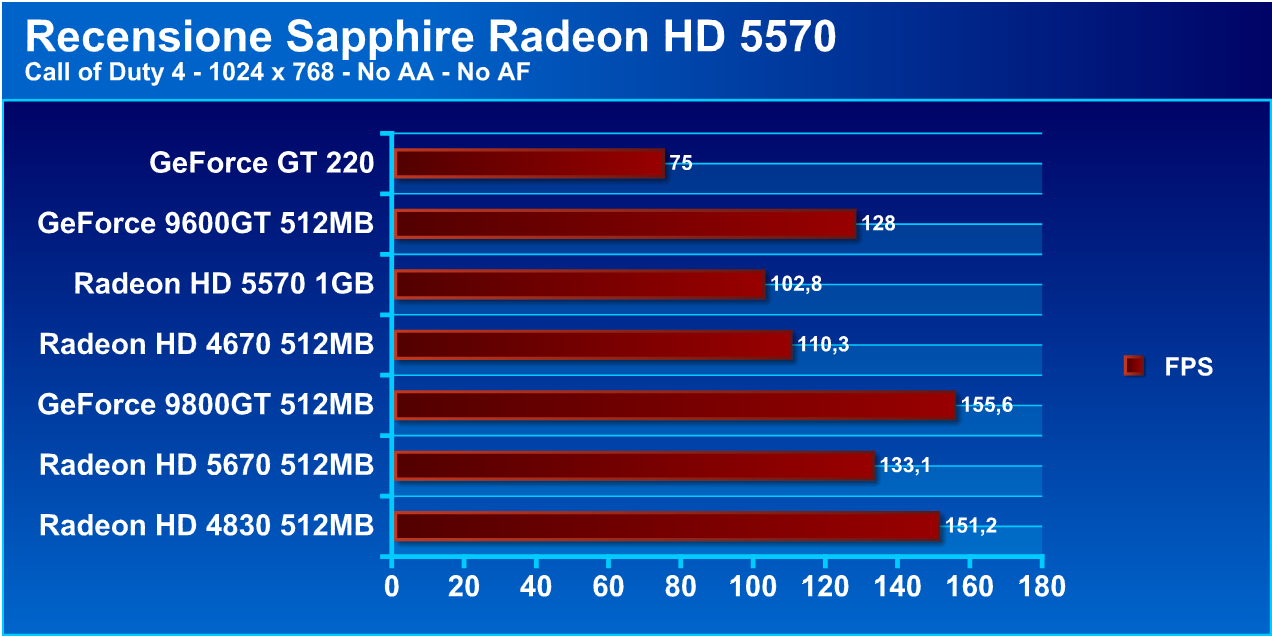 Anche con il videogioco Call of Duty 4 la situazione è del tutto invariata. Da una parte troviamo la scheda NVIDIA GeForce 9800GT, miglior soluzione tra quelle provate, dall’altra la Radeon HD 5570 staccata di diversi FPS rispetto alla rivale HD 4670.
