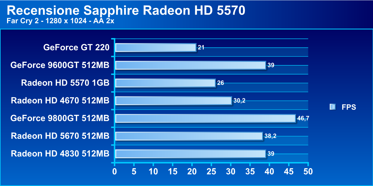 Con risoluzione di 1680 x 1050, Far Cry 2 risulta giocabile solo ed esclusivamente con la soluzione GeForce 9800GT. La Radeon HD 5570 fa registrare risultati molto simili alla proposta HD 4670 e HD 4830.