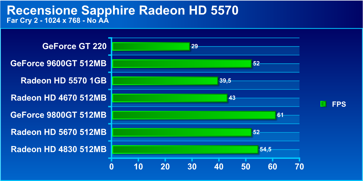 Con risoluzione di 1024 x 768 sono le proposte targate NVIDIA a far registrare i migliori risultati, seguite dalle schede Radeon HD 4830 e HD 5670. Per quanto riguarda la scheda Radeon HD 5570, si registrano risultato molto simili alla versione HD 4670.