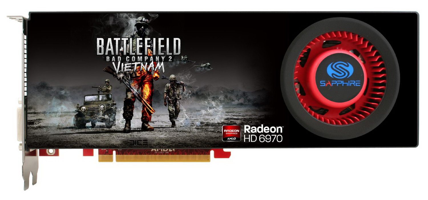 Il design generale della scheda è molto simile a quello della Radeon HD 6950. Il lavoro di personalizzazione svolto da Sapphire è ben riuscito e conferisce alla scheda maggiore qualità e professionalità; nella parte anteriore sono infatti presenti alcuni adesivi del videogioco Battlefield Bad Company 2 Vietnam.