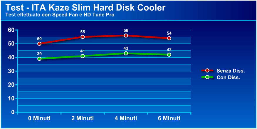 Nella prima fase di test, senza alcun sistema di dissipazione, abbiamo registrato una temperatura iniziale, in idle, di circa 50° che successivamente, dopo l’esecuzione del benchmark, è arrivata fino ad un massimo di 56°. Nella seconda fase di test invece, con dissipatore ITA Kaze montato sulla periferica, abbiamo registrato una temperatura in idle di 39° (circa 11° in meno rispetto al test precedente), ed una temperatura massima, dopo aver eseguito il bench, di circa 43°.