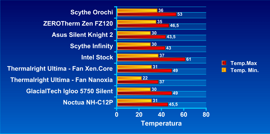 Come è possibile vedere dai test, le temperature in full risultano stranamente molto alte rispetto alla concorrenza. Il motivo principale di questo strano risultato è dovuto, come prevedibile, alla velocità di rotazione della ventola di soli 500RPM, un valore troppo basso per una dissipatore di queste dimensioni, e che mette da parte una dissipazione più veloce ed efficace a favore di una silenziosità di lavoro superiore. Nonostante tutto comunque, l’Orochi risulta estremamente performante, tant’è che siamo riusciti a raggiungere senza molti problemi la velocità di 4000MHz da parte del Core della CPU.