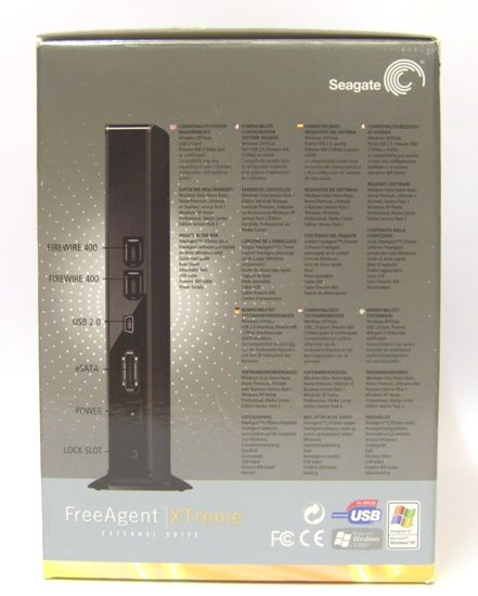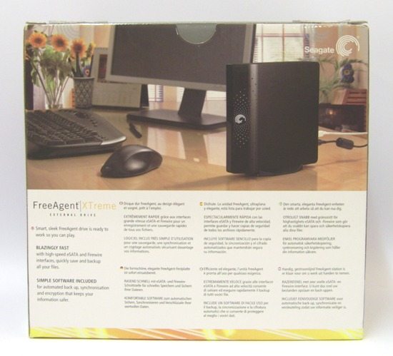 La confezione del Seagate FreeAgente XTreme è abbastanza compatta (206mm x 152mm x 224mm): realizzata in cartone rigido, presenta su tutti i lati foto ed informazioni a proposito del FreeAgente XTreme; in primo piano si possono leggere i dati (dichiarati da Seagate) riguardo le capacità teoriche di archiviazione, ovvero fino a 320000 foto, 240000 files musicali oppure circa 1000 ore di filmati in qualità standard. Inoltre è da segnalare la garanzia della casa madre che arriva a 5 anni.