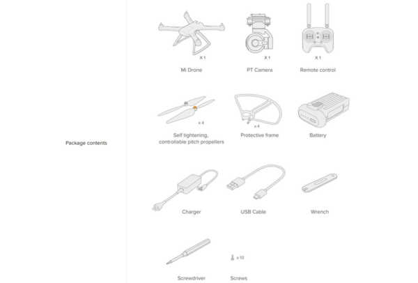 Lo Xiaomi Mi Drone 4K viene consegnato in una scatola di cartone con all’interno un adattore per le prese italiane.