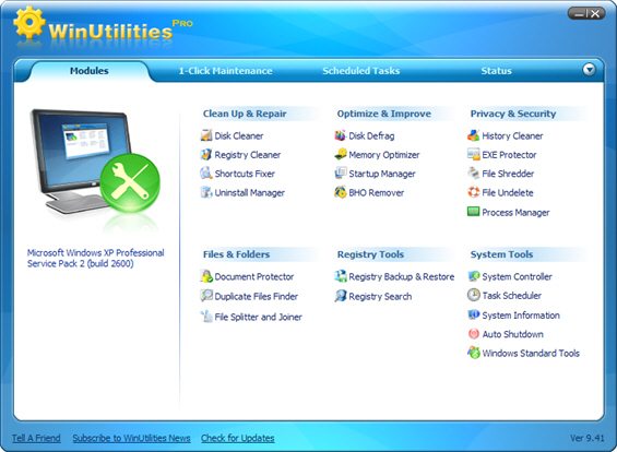Questi i moduli presenti in WinUtilities Professional Edition: